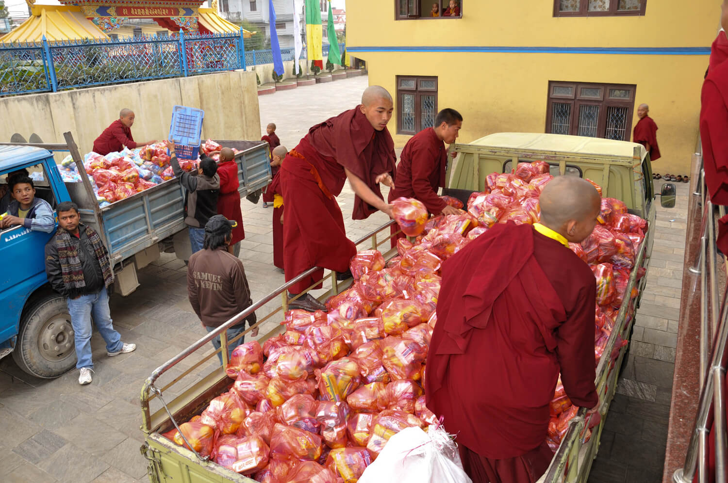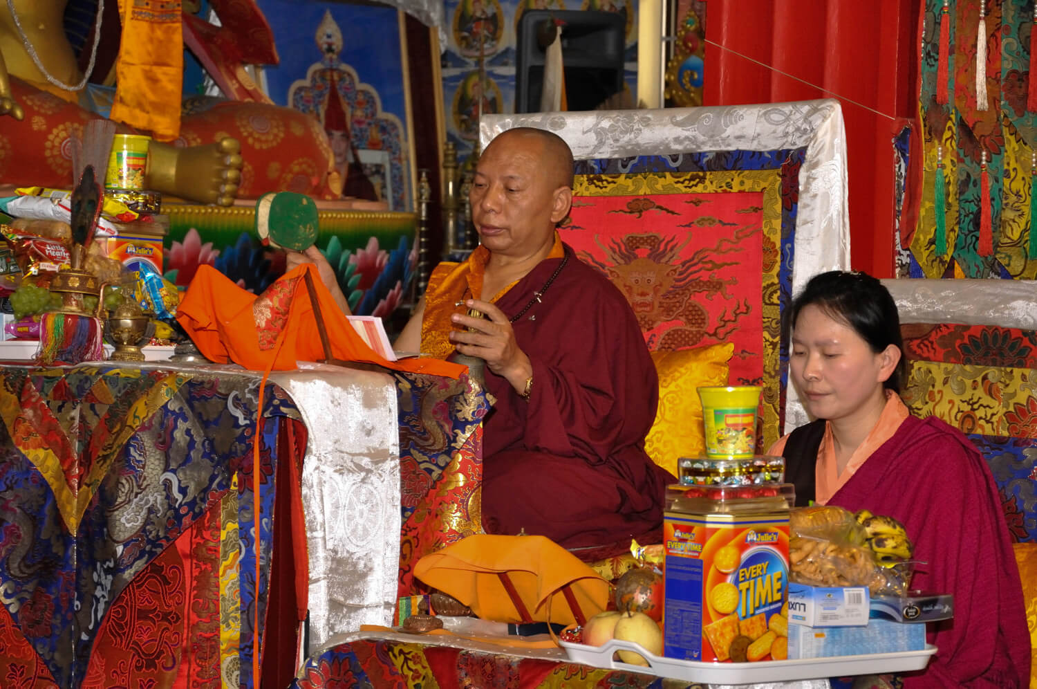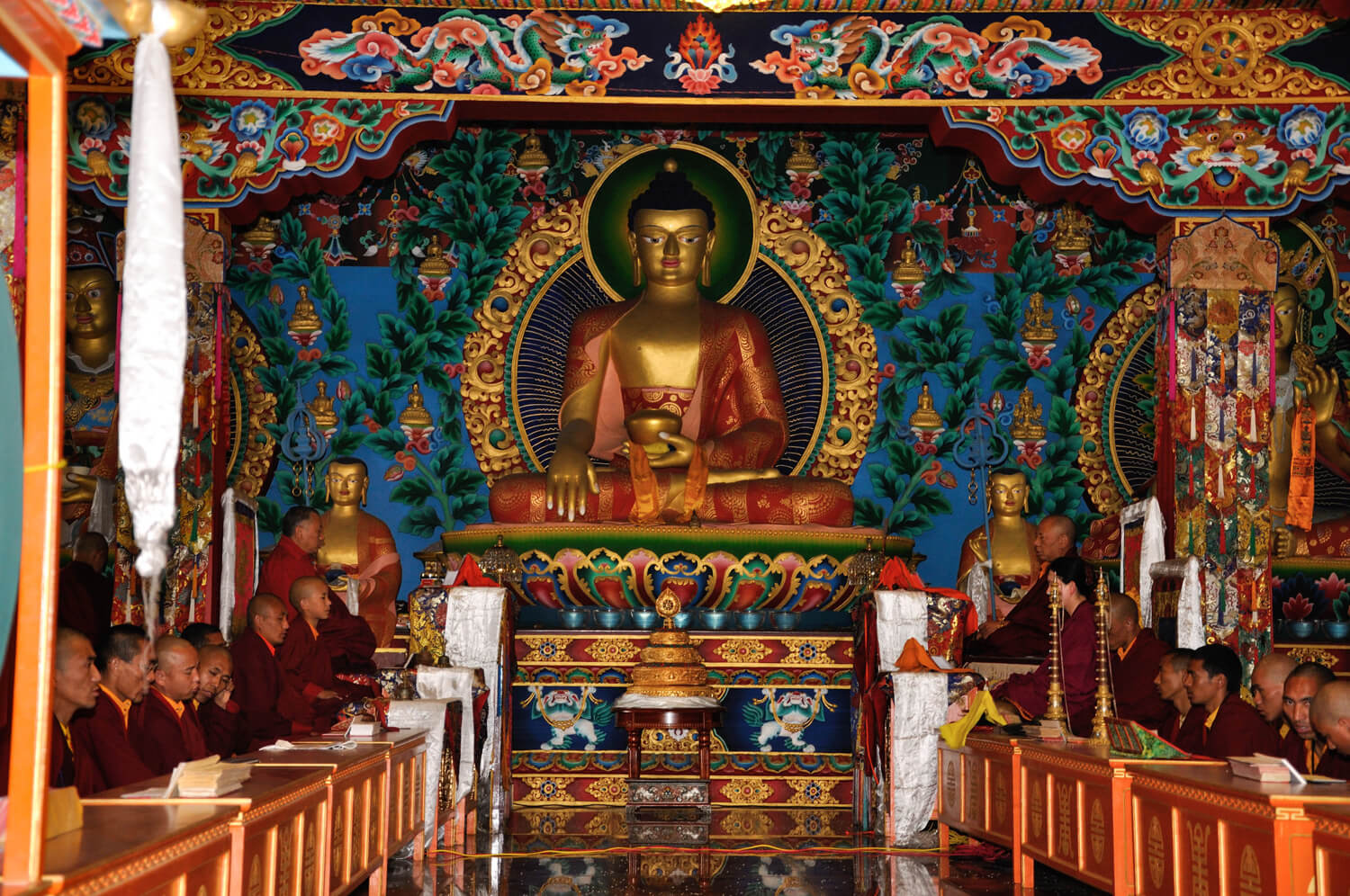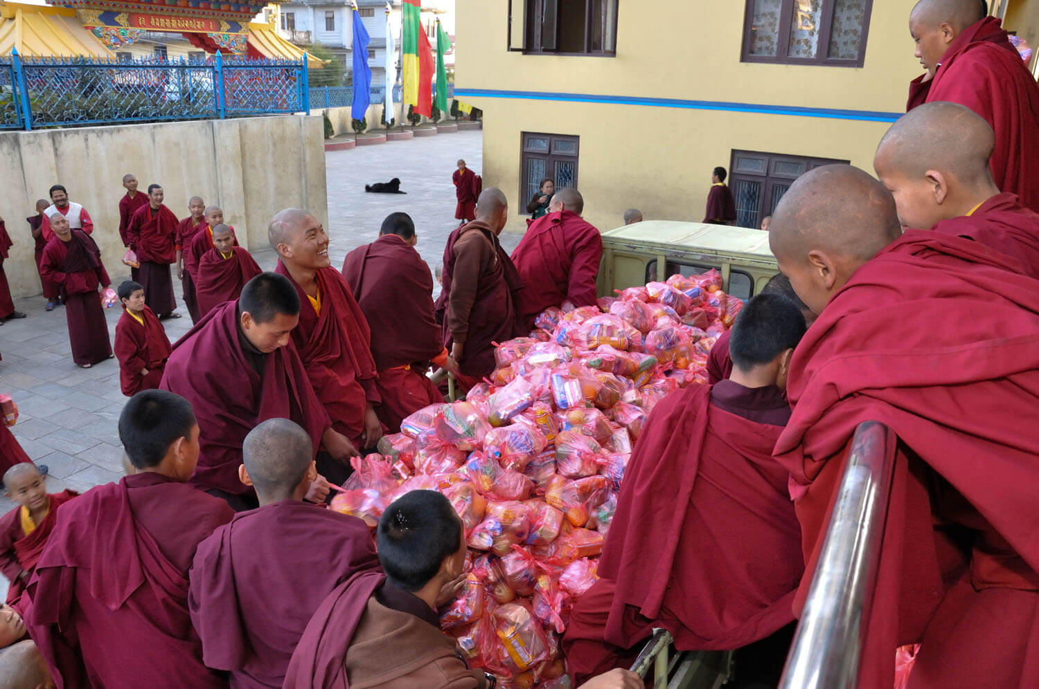 每年的藏历正月为神变月,这段时日所累积的功德将增长成为十万倍,所以佛学院每年年初会举办十万遍荟供大法会。不单只因正逢神变月,一年之始的吉祥缘起,所以累积善事是正面的缘起,就是播正面的种子,所获也一定事是正面吉祥的结果,因此大家都很欢喜地荟供累积善事。 法会的筹备时,会尽量准备殊胜清净的供品,僧众们聚集念诵仪轨,每天不断更新供品,在仁波切的带领下完成数日的荟供,历年来,因举办日数的不同,可圆满二十万到六十万遍不等的荟供。