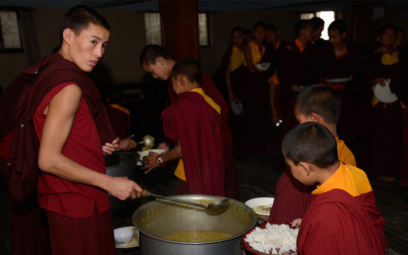 一昼一夜的作息顺序如下:清晨4:30~6:00晨钟起板,各自洗漱。精进念修本尊的咒文或背诵经典等各种不同法行。