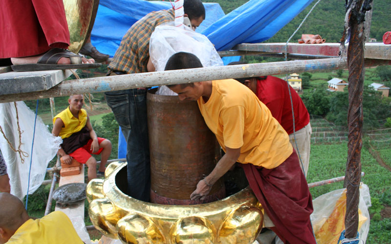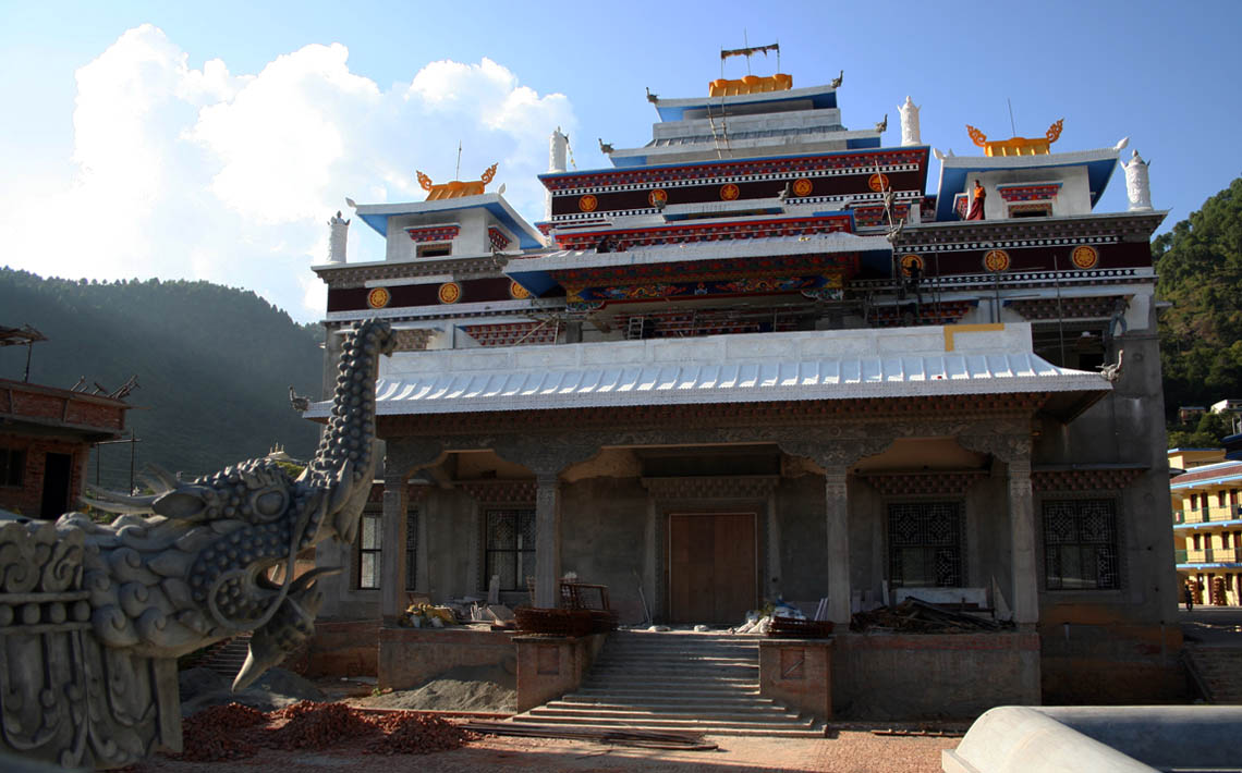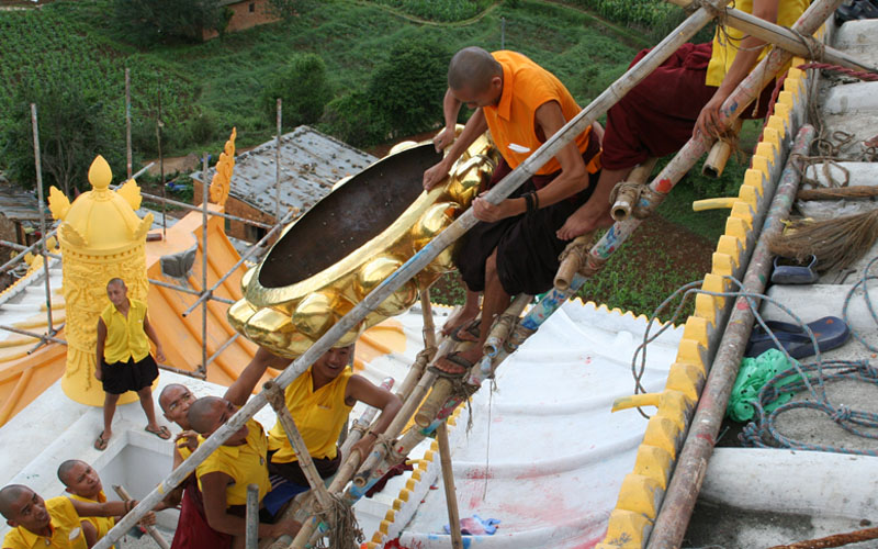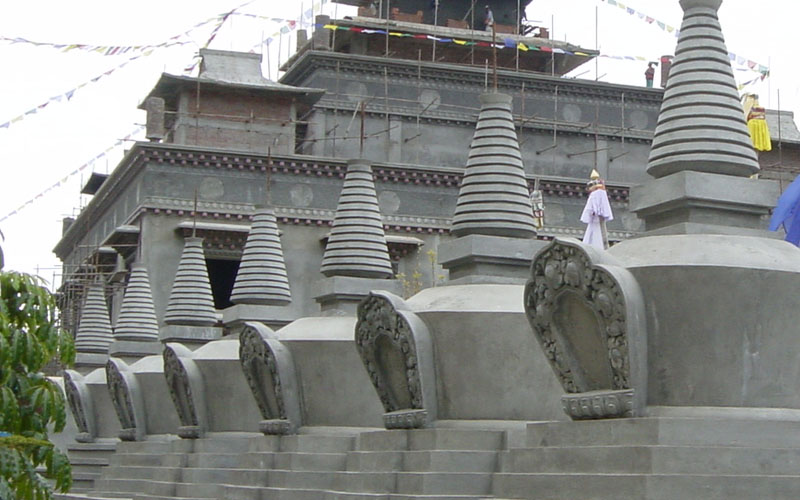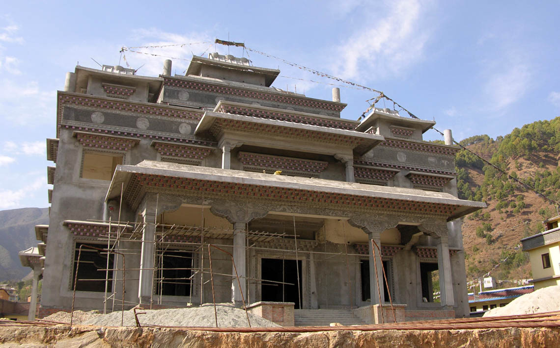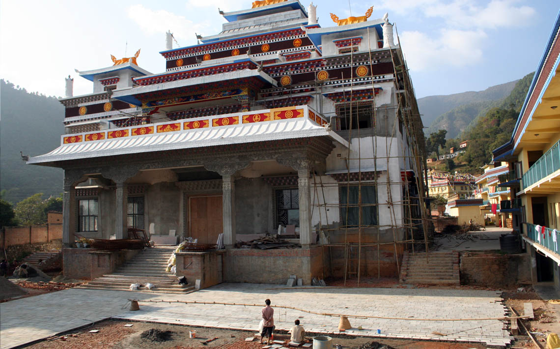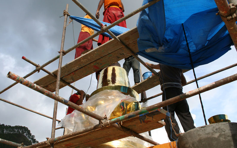 从觅地、设计、筹资、挑选建材、工匠,到历时数年的建筑工事,全是尊贵的仁波切和佛母不辞艰辛地亲自参与每个过程和细节,因有这般圆满的清净发心和行事,始呈现如法王 董瑟听列诺布仁波切亲喻首屈一指的圆满佛寺。 法王说道:此桑耶纪念佛寺对宁玛巴传承及世人而言,恩德等同莲师净土铜色吉祥山,是自然天成的摩尼宝,是圆满累积福慧资粮的殊胜所依。